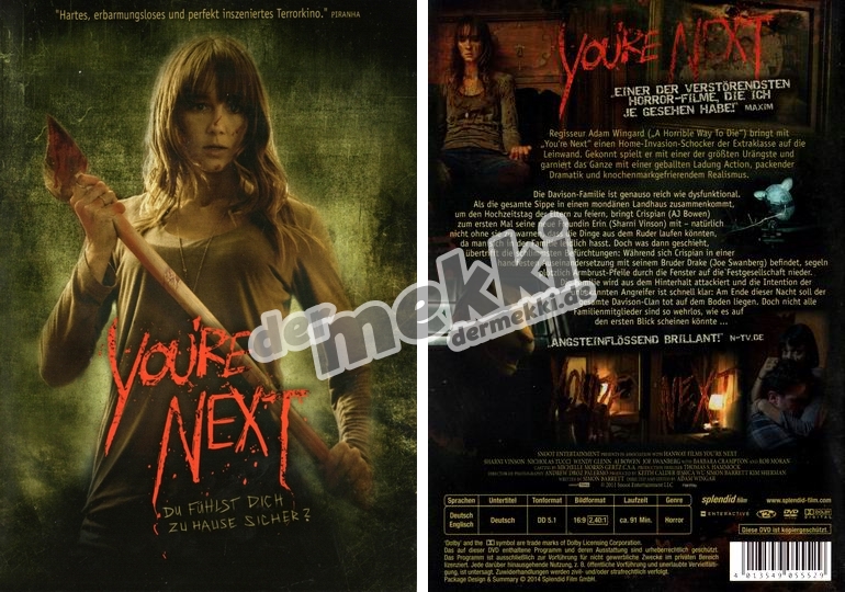 Tauchen Sie ein in die düstere Welt des Horrors mit dem hochgelobten Film "You're Next". Diese DVD ist ein Muss für alle Liebhaber des Genres und garantiert Ihnen schaurige Nächte voller Spannung und Nervenkitzel.