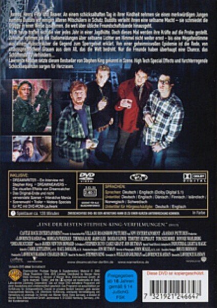 Erleben Sie den packenden Horror-Thriller "Dreamcatcher" nach dem weltberühmten Roman von Stephen King auf DVD. Diese filmische Adaption vereint die beeindruckenden Schauspielkünste von Morgan Freeman, Thomas Jane, Jason Lee, Damian Lewis, Timothy Olyphant, Tom Sizemore und Donnie Wahlberg.