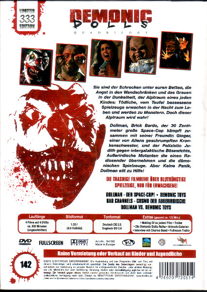 Sichern Sie sich noch heute Ihre Edition und erleben Sie die Schrecken, die in Charles Band's „Demonic Dolls Quadrilogy“ lauern. Lassen Sie sich von der düsteren Magie dieser Filme verzaubern und genießen Sie zahlreiche Stunden voller Spannung und Nervenkitzel!