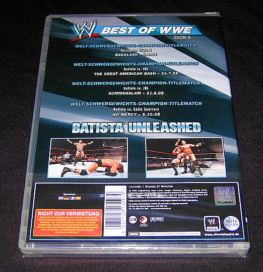 Batista ist einer der großen Stars der WWE! Diese DVD enthält 4 seiner besten Matches! Mit Batista, Triple H, JBL u.v.a. Matches: - Welt-Schwergewichts-Champion-Titlematch Batista vs. Triple H BACKLASH - 01.05.05 - Welt-Schwergewichts-Champion-Titlematch Batista vs. JBL THE GREAT AMERICAN BASH - 24.07.05 - Welt-Schwergewichts-Champion-Titlematch Batista vs. JBL SUMMERSLAM - 21.08.05 - Welt-Schwergewichts-Champion-Titlematch Batista vs. Eddie Guerrero NO MERCY - 09.10.05
