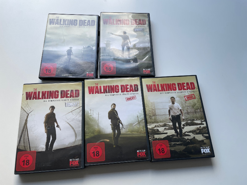 Verkaufe die deutschen The Walking Dead Staffel 2+3+4+5+6 Special Uncut DVD Boxen, ein paar DVDs haben leichte Gebrauchsspuren. Laufen aber einwandfrei und bei zwei Boxen sind leider die Halter für jeweils eine DVD von der Hülle gebrochen.