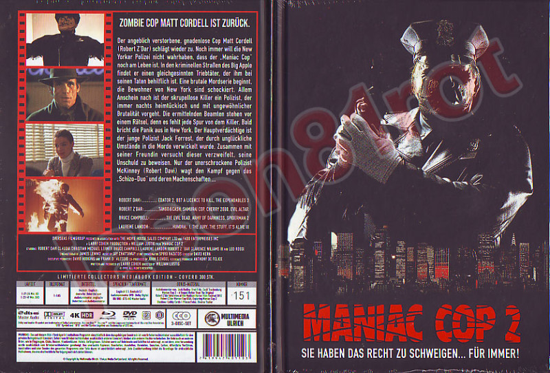 Erleben Sie die schaurige Rückkehr von Zombie Cop Matt Cordell in grandioser 4K Ultra HD Qualität mit der limitierten Mediabook Edition von "Maniac Cop 2 II." Diese auf lediglich 300 Stück begrenzte Sammleredition (Cover B) ist der perfekte Fang für jeden Horrorfilm-Enthusiasten. Die ungeschnittene Fassung bietet einen perfekten Mix aus Spannung, Action und Horror, der Ihr Heimkino auf ein neues Niveau hebt. Lassen Sie sich von der hochauflösenden Wiedergabe und dem glasklaren Ton in die düsteren Straßen von New York City entführen, wo der unaufhaltsame Matt Cordell wieder auf Rachefeldzug geht. Ein Muss für jeden Fans von klassischen Horrorfilmen und ein Highlight in jeder Filmsammlung!