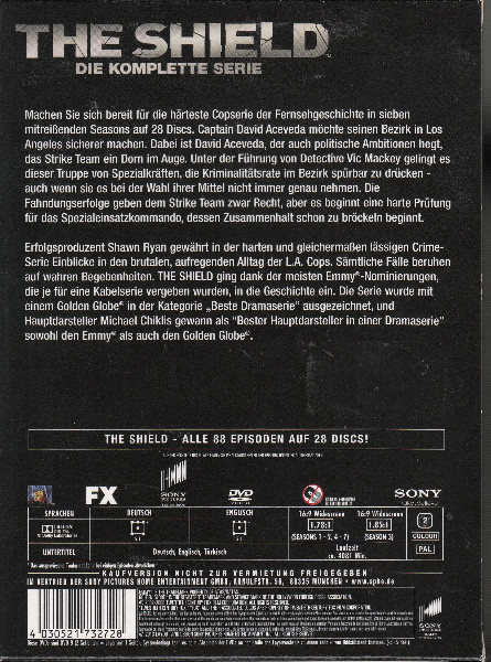 Tauchen Sie ein in die Premiummarke der Crime-Serien mit der kompletten Collection von "THE SHIELD", bestehend aus beeindruckenden 28 DVDs. Dieses Meisterwerk, das zu den fesselndsten und wirkungsvollsten Fernsehproduktionen zählt, garantiert Ihnen unzählige Stunden mit Nervenkitzel und schockierenden Wendungen. Die Serie erlangte Kultstatus durch ihre kompromisslose Darstellung von Recht und Ordnung und berührt dabei die moralischen Grauzonen der Charaktere. Ein Muss für jeden Action- und Crime-Liebhaber. Jetzt in der Kategorie DVD, Action erhältlich!