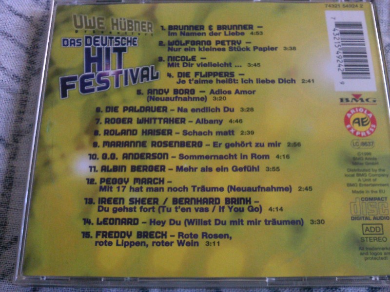 Erleben Sie die ultimative Sammlung deutscher Schlagerlegenden auf einer einzigen CD! "Uwe Hübner präsentiert: Das Deutsche Hit Festival" bietet eine sorgfältig zusammengestellte Auswahl von Hits, die das Herz jedes Schlagerfans höher schlagen lassen. Diese außergewöhnliche CD vereint die größten Stars der deutschen Musikszene, darunter Roland Kaiser, Nicole, Die Flippers, Brunner & Brunner sowie Wolfgang Petry. Lassen Sie sich von unvergesslichen Melodien und zeitlosen Klassikern verzaubern, die jede Party unvergesslich machen. Die hohe Qualität und der nostalgische Charme dieser Sammlung machen sie zu einem unverzichtbaren Schatz für jeden Liebhaber deutscher Musik. Greifen Sie jetzt zu und gönnen Sie sich oder Ihren Liebsten dieses Stück Musikgeschichte!