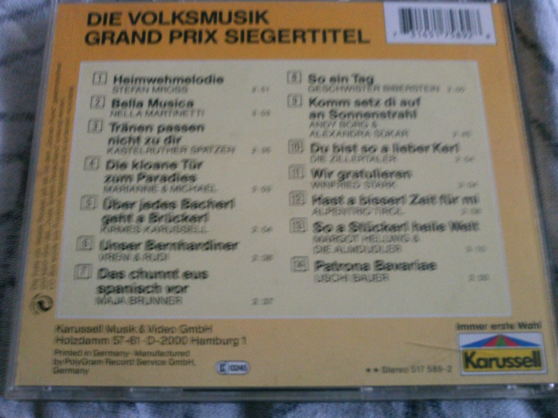 Tauchen Sie ein in die wunderbare Welt der Volksmusik mit dieser exquisiten CD "Die Volksmusik - Grand Prix Sieger-Titel". Diese Sammlung vereint die besten Titel und größten Hits der Szene, darunter unverkennbare Melodien von Top-Interpreten wie Stefan Mross, Die Zillertaler, Marianne & Michael, Andy Borg und Alexandra sowie die Kastelruther Spatzen. Erleben Sie Herzstücker wie "Tränen passen nicht zu dir", "Du bist so a lieber Kerl" und den beliebten Tanzklassiker "Patrona Bavariäe".
