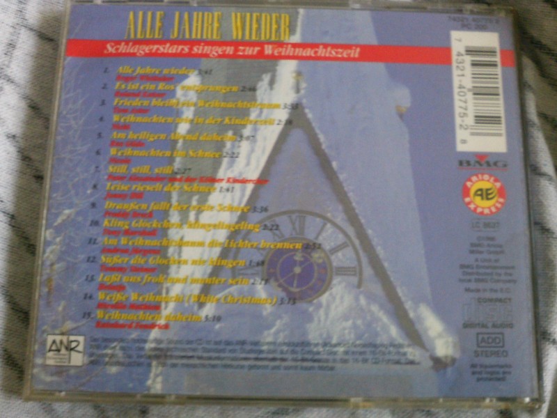 Genießen Sie die festliche Zeit des Jahres in vollen Zügen mit der CD "Alle Jahre Wieder". Diese Sammlung von Weihnachtsliedern, interpretiert von den größten Schlagerstars, wird Ihr Herz erwärmen und Ihnen unvergessliche Momente bescheren. Sichern Sie sich diese musikalische Perle und lassen Sie die Magie der Weihnacht in Ihr Zuhause einziehen.