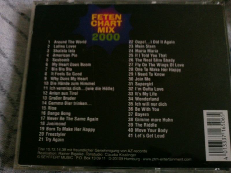 Hol Dir jetzt den "Feten Chart Mix 2000" und erlebe eine musikalische Zeitreise direkt ins Herz des Jahres 2000. Perfekt für jedes Event, egal ob in kleiner Runde oder auf großen Feiern – diese CD ist der Garant für ausgelassene Stimmung und durchgetanzte Nächte. Bestelle noch heute und mach Deine nächste Party zu einem unvergesslichen Erlebnis!