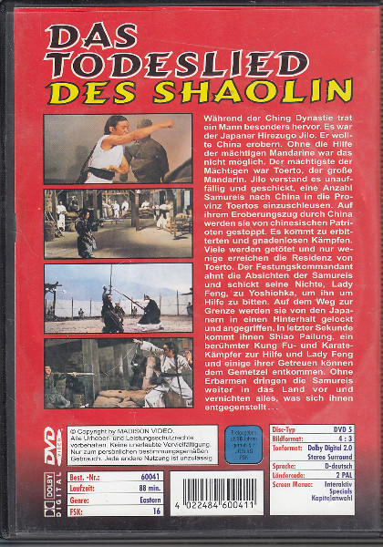 In "Das Todeslied des Shaolin" schlagen die Fäuste zu einem tödlichen Rhythmus, während meisterhafte Kampfkünstler ihren Mut, ihre Fähigkeiten und ihren unerbittlichen Kampfgeist unter Beweis stellen. Mit beeindruckenden Kampfszenen, intensiven Duellen und einer packenden Story hält diese DVD Sie auf Trab und lässt Ihre Adrenalinspiegel steigen.