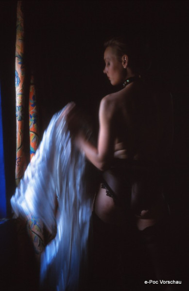Das Bild zeigt eine beeindruckende szenische Komposition, in der die Nuancen von Licht und Schatten meisterhaft dazu genutzt werden, die Schönheit des menschlichen Körpers zu betonen und ein mystisches, fast geheimnisvolles Ambiente zu schaffen. Die stilisierte Darstellung und die subtile Erotik dieser Aufnahme machen dieses Dia zu einem unverzichtbaren Kunstwerk für Sammler und Kenner der erotischen Fotografie.