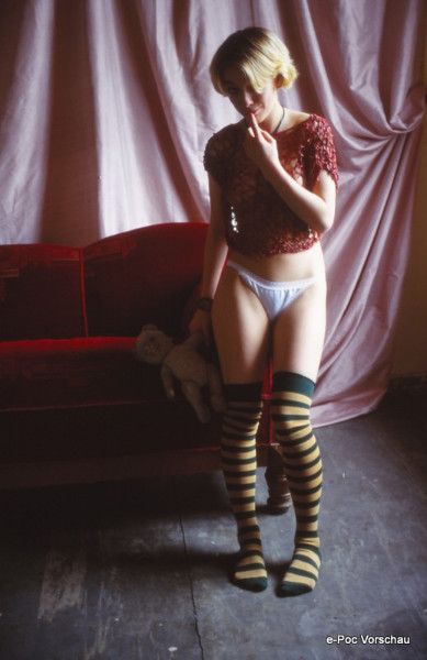 Die sorgfältige Komposition und das natürliche Lichtspiel heben die feinen Details hervor, von der zarten Textur des Oberteils bis zu den spielerisch gestreiften Socken, die bis zu den Knien reichen. Dieses Dia ist ein Muss für Sammler und Liebhaber von erotischer Kunst und Fotografie. Es bietet nicht nur einen Einblick in die künstlerische Vision von Dominik Alterio, sondern verkörpert auch einen bedeutenden Teil der Erotikkultur.