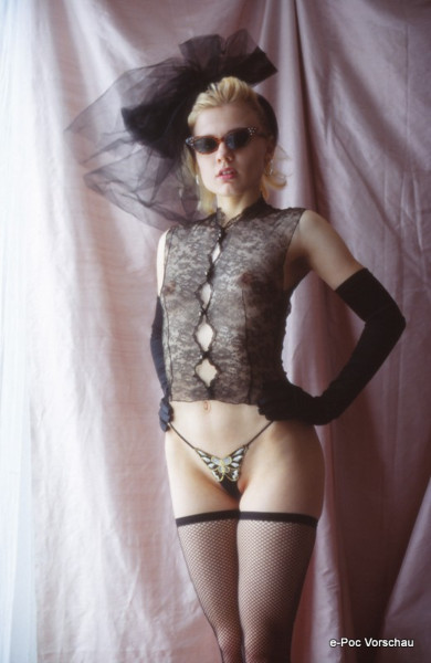 Spitzen-Top: Das abgebildete Modell trägt ein raffiniertes, durchsichtiges Spitzen-Top, das subtil und gleichzeitig provokativ ist. Es lässt durch seine filigranen Muster viel Freiraum für die Fantasie und unterstreicht die natürliche Schönheit seines Trägers.
