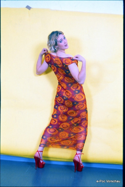 Das Erotikdia "bn14-33-30" zeigt eine atemberaubende Frau in einem auffallend eleganten, transparenten Kleid mit einem leuchtenden, psychedelischen Muster. Die Farben Rot und Orange dominieren und erzeugen eine visuelle Intensität, die den Betrachter in ihren Bann zieht. Die Pose der Frau ist sowohl verführerisch als auch selbstbewusst und verkörpert ein Gefühl von Freiheit und Sinnlichkeit.