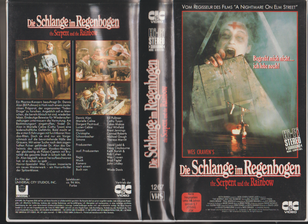 Erleben Sie den puren Schrecken mit Wes Craven's Meisterwerk "Die Schlange im Regenbogen" auf VHS – ein Muss für Liebhaber des Horrorgenres. Von dem talentierten Regisseur von "A Nightmare on Elm Street" bringt dieser Film den Terror direkt in Ihr Wohnzimmer. In den Hauptrollen brillieren Bill Pullman und Cathy Tyson, die den Zuschauer in eine mysteriöse und furchteinflößende Welt entführen. Der Film basiert auf einer wahren Geschichte und taucht tief in die Praktiken von Voodoo und mysteriösen Ritualen ein, während Dr. Dennis Alan (Bill Pullman) sich in Haiti auf die Suche nach einem legendären Todespulver begibt. Die spannende Handlung und die unheimliche Atmosphäre werden Sie den Atem anhalten lassen. Perfekt für einen gruseligen Filmabend!