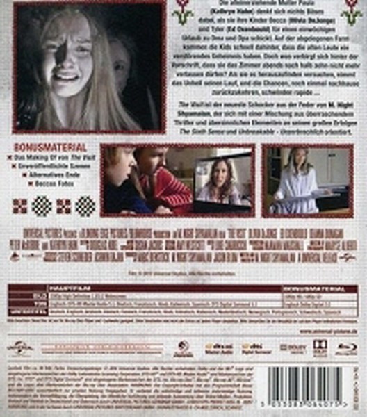 Tauchen Sie ein in die packende und verstörende Welt von "The Visit", einem fesselnden Horrorfilm vom renommierten Regisseur M. Night Shyamalan, bekannt für seine Werke wie "The Sixth Sense", "The Village" und "Signs". Diese Blu-ray bringt Ihnen die schaurige Geschichte von zwei Geschwistern, die ein ausgesprochen unheimliches Wochenende bei ihren Großeltern verbringen. Die unerklärlichen Ereignisse und unerwarteten Wendungen werden Sie bis zur letzten Minute in den Bann ziehen.