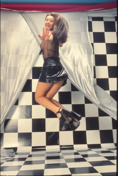 Entdecken Sie die Exklusivität und ästhetische Ausstrahlung mit dem ungerahmten Erotikdia "bn17-84-26". Ein echtes Highlight für Sammler und Liebhaber von kunstvoller Fotografie im Bereich Erotik. Das Dia zeigt eine dynamische und lebendige Inszenierung, die sowohl lebhaftigkeit als auch eine gewisse verspielte Eleganz ausstrahlt. Eingebettet in einen eindrucksvollen Hintergrund mit schwarz-weißen Kacheln und einem farblichen Kontrast durch rote und weiße Elemente, hebt sich das Hauptmotiv – eine Frau in einem glänzenden schwarzen Outfit – besonders hervor.