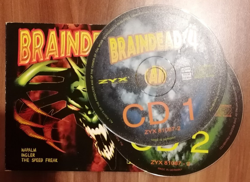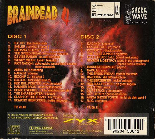 Zum Verkauf steht die 2CD-Compilation "Braindead 4" (Shockwave Recordings / ZYX, 1996) diverser Interpreten; u.a. The Speed Freak, B.C.Kid, Ingler (Laurent Hô), DJ Dano, Hate Squad. Digipak-Hülle.