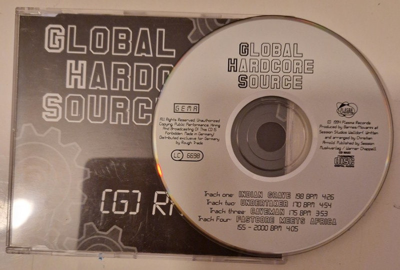 Zum Verkauf steht die CD-EP "(G) Rave E.P." (P.L.A.S.M.A. Records, 1994) des (Hardcore) Techno-Trios Global Hardcore Source (Christian Arnold alias Terror Arnold/X-Cusiver zusammen mit den Masterboy-Mitgliedern Tommy Schleh (alias Klubbingman/Jeff Barnes) und Enrico Zabler (alias Rico Novarini)).
