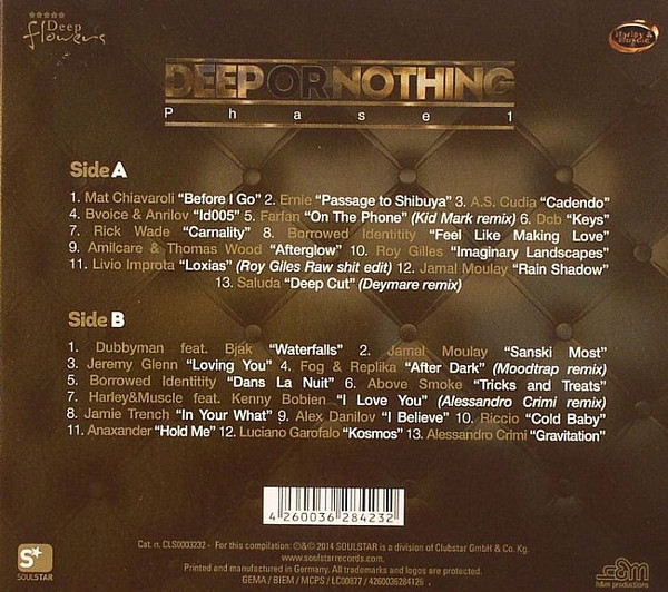 Zum Verkauf steht die vom italienischen House-Duo Harley & Muscle gemixte 2CD-Compilation "Deep Or Nothing Phase 1" (Soulstar, 2014) diverser Interpreten; u.a. Mat Chiavaroli, Farfan, Roy Giles, Fog & Replika und Harley & Muscle feat. Kenny Bobien. Digipak-Hülle.
