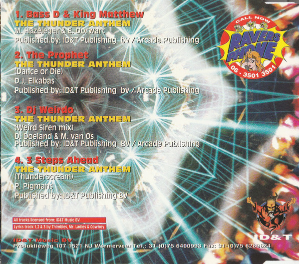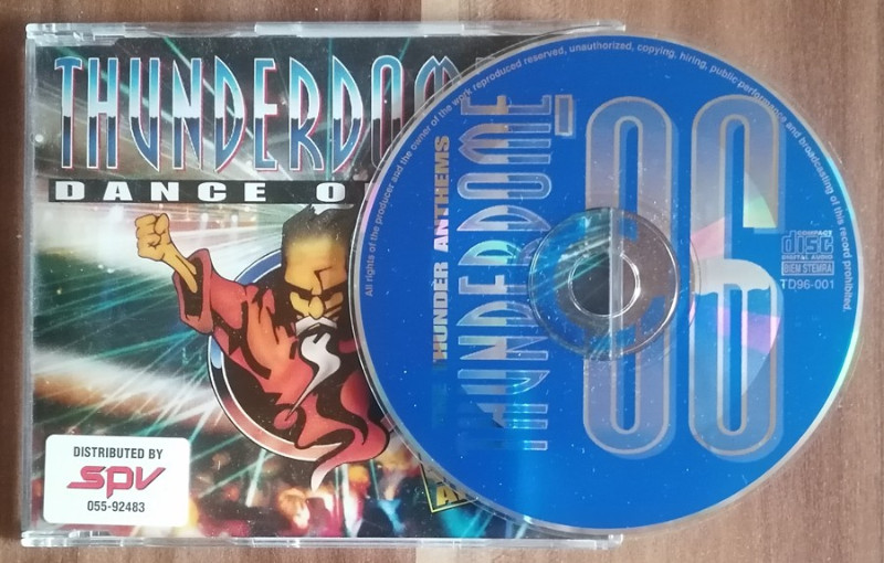 Zum Verkauf steht die 1CD-Compilation "Thunderdome ''96 - Dance Or Die! - The Thunder Anthems" (ID&T, 1996) mit den Party-Hymen von Bass-D & King Matthew, The Prophet, DJ Weirdo und 3 Steps Ahead. Inklusive SPV-Aufkleber auf der CD-Hülle (nicht Cover).