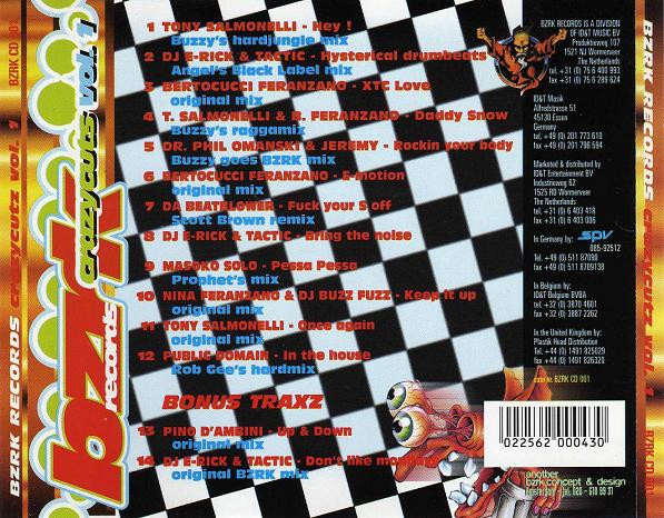 Zum Verkauf steht die vom niederländischen Hardcore Techno-Produzenten (DJ) Buzz Fuzz (alias Tony Salmonelli, Bertocucci Feranzano etc.) zusammengestellte (nicht gemixte) 1CD-Compilation "BZRK Records - Crazycutz Vol.1" (BZRK Records, 1997) diverser Interpreten; u.a. Tony Salmonelli, DJ E-Rick & Tactic, Masoko Solo, Public Domain.