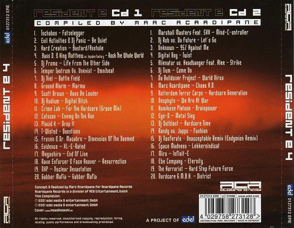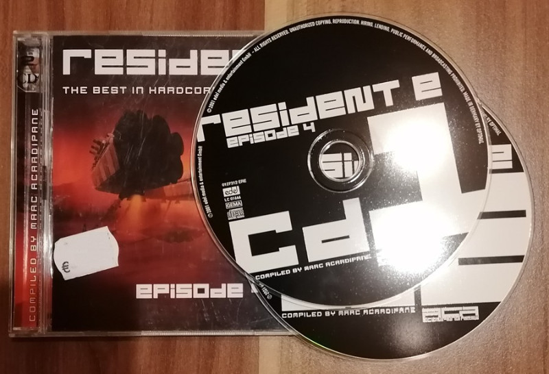 Zum Verkauf steht die 2CD-Compilation "Resident E Episode 4 - The Best In Hardcore, Gabber & Rave!" (Acardipane Records / Edel, 2001) diverser Interpreten; u.a. Marc Acardipane (alias Marshall Masters), (DJ) Promo, Scott Brown, Radium und Neophyte. Der auf dem ersten Bild zu sehende weiße Aufkleber befindet sich auf der CD-Hülle (nicht auf dem Cover) und lässt sich entfernen.