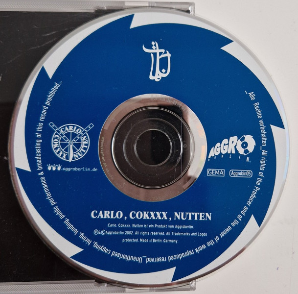 Zum Verkauf steht die 1CD-Veröffentlichung "Carlo Cokxxx Nutten" (Aggro Berlin, Optimal Media Production-Nachpressung von 2003(?)) der Rapper Sonny Black (Bushido) und Frank White (Fler). Die CD ist türkisgrün, nicht blau; die Farbe scheint nur schwierig für Mobiltelefonkameras zu sein.