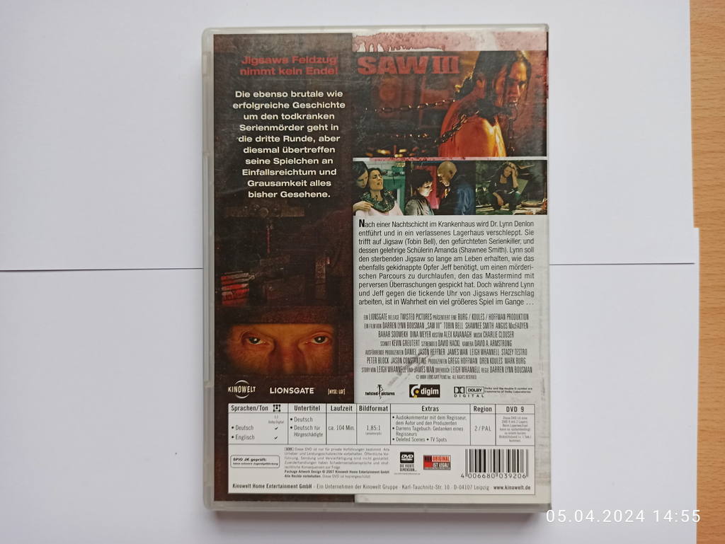 Entdecken Sie den dritten Teil der ikonischen SAW-Reihe mit dem fesselnden Titel "SAW 3 - Hast Du das Leben verdient?" Diese DVD ist ein absolutes Muss für jeden Horrorfilm-Liebhaber und entführt Sie in eine düstere Welt voller Spannung und Unberechenbarkeit.