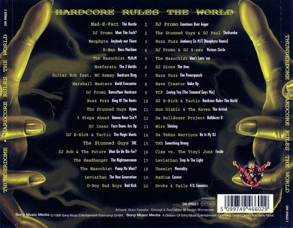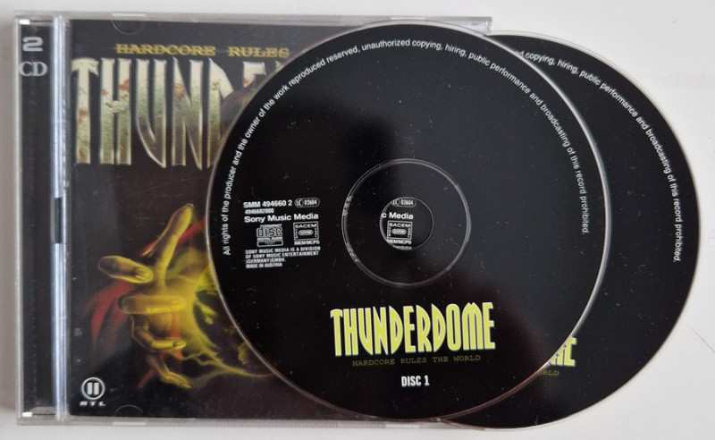 Zum Verkauf steht die deutsche (nicht niederländische) Version der 2CD-Compilation "Thunderdome - Hardcore Rules The World" (Sony Music Media, 1999; Katalognummer: SMM 494660 2) diverser Interpreten; u.a. Neophyte, (DJ) Promo, 3 Steps Ahead, Marshall Masters (Marc Acardipane), The Masochist (The Prophet), Miro, DJ Isaac, Don Diablo & The Raven, Drokz.