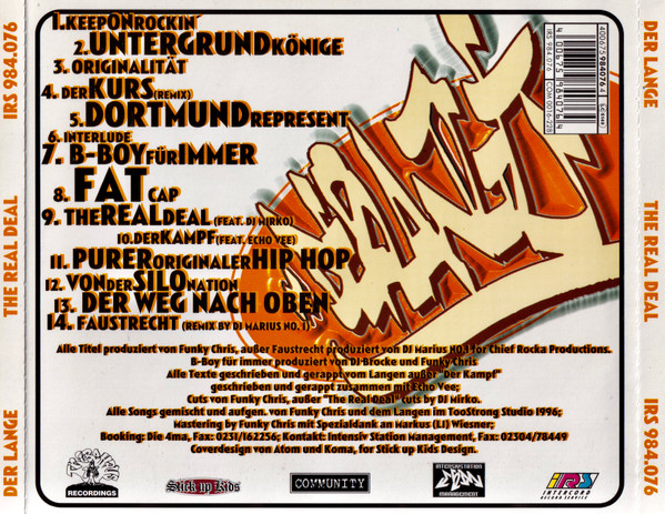 Zum Verkauf steht die 1CD-Veröffentlichung "The Real Deal" (Community/Intercord Record Service, 1996 - Erstpressung, NICHT die Neuveröffentlichung mit Virgin als Vertrieb!) der Rapper Der Lange (auch bekannt als AtomOne) und (DJ) Funky Chris; beide Teil der Gruppe Too Strong.