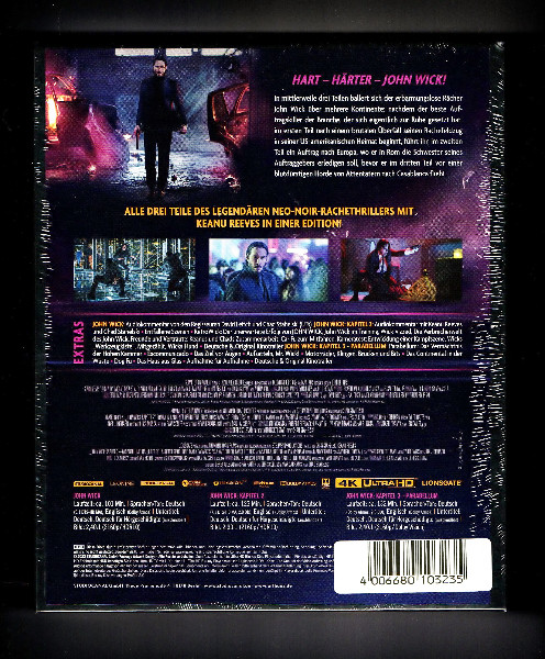 Bonusmaterial: 32-seitiges Booklet - 3 Poster - 6 Artcards - Continental Hotel Schlüsselanhänger - Featurette - Audiokommentar - Making of - Trailer - Trailershow und vieles mehr....