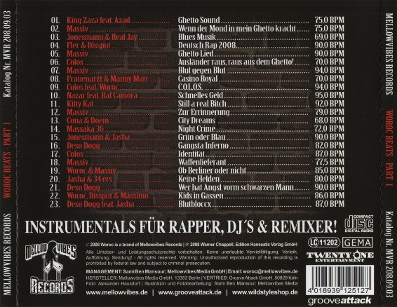 Zum Verkauf steht die 1CD-Veröffentlichung "Woroc Beats - Seine Hits als Instrumental - Part 1" (Mellowvibes Records / Twenty One Entertainment, 2008) des Produzenten und Rappers Woroc (Teil der HipHop-Gruppen VS Mafia, Killa Kombo etc.). Sie enthält Instrumentaltracks, die Woroc für andere Rapper (King Zaza feat. Azad, Massiv, Nazar & RAF Camora etc.) produziert hat. Limitiert auf 2000 Stück.