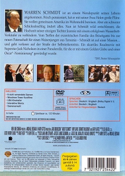 "About Schmidt" ist nicht nur ein Film, sondern eine emotionale Reise, die uns daran erinnert, dass es nie zu spät ist, die Welt neu zu entdecken und sich selbst zu finden. Mit seiner perfekten Mischung aus Ernsthaftigkeit und Humor bietet dieser Film ein Filmerlebnis, das lange im Gedächtnis bleibt. Diese DVD ist ein Muss für jeden Filmfan und eine wertvolle Ergänzung für jede Heimkino-Sammlung.