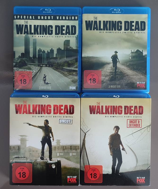 zu verkaufen sind Staffeln 1-4 von The Walking Dead auf BluRay. Da die Scheiben bei uns nur mit Baumwollhandschuhen angefasst werden und auch nur einmal geschaut wurden, sind sie im Bestzustand.