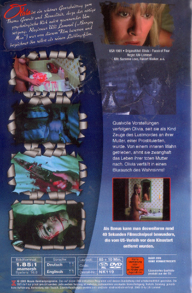 Tauchen Sie ein in eine Welt voller Spannung und Nervenkitzel mit der DVD "Olivia - Im Blutrausch des Wahnsinns". Unter der Regie von Ulli Lommel, bekannt für seinen kultigen Stil in Filmen wie "Boogey Man", präsentiert diese DVD ein unvergessliches Horrorerlebnis, das Horrorfans auf der ganzen Welt begeistern wird.