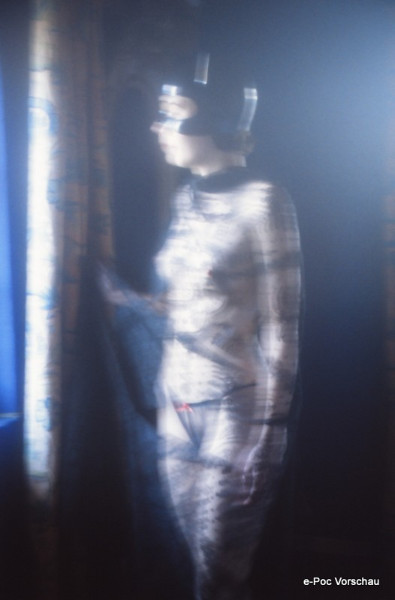 Das Dia zeigt eine geheimnisvoll verschleierte Figur in vielschichtigen Blautönen, was eine fast traumhafte Atmosphäre schafft. Diese zarte Verschleierung betont die Intimität des Moments, während der Einsatz von weichem Licht und Schatten die Sinnlichkeit des Motivs hervorhebt. Es handelt sich hierbei um ein echtes Sammlerstück, das nicht nur für Liebhaber des Erotischen, sondern auch für ernsthafte Sammler von Kunstfotografie eine Bereicherung darstellt.