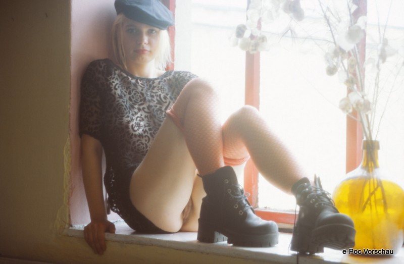 Diese seltene Dia ist mehr als nur ein Bild; es ist ein Portal in die 90er Jahre, wo Dominik Alterio mit seiner einzigartigen Ästhetik die Grenzen der Erotikfotografie neu definierte. Die Darstellerin, gekleidet in einem gemusterten Minikleid, Netzstrumpfhose und robusten Stiefeln, bildet einen starken Kontrast zu ihrem zarten Sitz auf der Fensterbank, was die Dualität von Stärke und Verletzlichkeit innerhalb des menschlichen Begehrens unterstreicht.