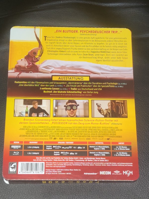 Erleben Sie Possessor, ein packender Film von Brandon Cronenberg, in atemberaubender 4K Ultra HD und Blu-ray-Qualität. Diese limitierte Steelbook Edition bietet nicht nur den Film ungeschnitten und unzensiert, sondern auch eine hochwertige Sammlerhülle, die jedes Heimkino aufwertet. Tauchen Sie ein in die hypnotische, elektrisierende und verstörende Welt von Possessor, die durch die brillanten HDR-Farben und den gestochen scharfen 100p Audio & Coloration Effekte verstärkt wird. Bestens geeignet für alle Liebhaber von Horror, die das ultimative Erlebnis suchen. Überzeugen Sie sich selbst von dieser einzigartigen und limitierten Edition und bereichern Sie Ihre Sammlung mit einem Meisterwerk der Filmkunst!