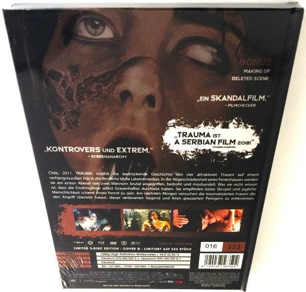Tauchen Sie ein in die düstere Welt des Horrors mit dem fesselnden Mediabook von "TRAUMA". Diese limitierte Kollektion bietet sowohl die Blu-ray als auch die DVD in ihrer ungeschnittenen Fassung. Verpackt in einem exklusiven Illusions Mediabook, ist dieses Produkt ein echter Blickfang für Sammler und Liebhaber des Genres. Erleben Sie die unzensierte Spannung und die eindringlichen Bilder, die nur ein OVP-Mediabook bieten kann. Perfekt für schaurige Filmabende und die Erweiterung Ihrer Horror-Sammlung.