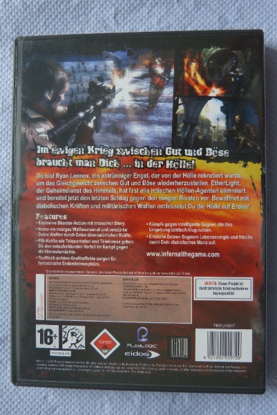 "Infernal" ist nur für DVD-kompatible PCs und verspricht stundenlangen Spielspaß mit einer Altersempfehlung von ab 16 Jahren. Entwickelt von Playlogic in Zusammenarbeit mit Eidos, den Machern einiger der meistverkauften Spiele, garantiert dieses Produkt Qualität und tiefgreifende Spielerfahrung.