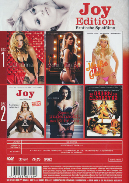 Entdecken Sie die "Joy Edition", eine exklusive Sammlung von 6 erotischen Spielfilmen, die Ihre Fantasie anregen und für aufregende Unterhaltung sorgen. Mit über 500 Minuten Laufzeit bietet dieses Set eine ausgiebige Erfahrung, die die Grenzen Ihrer Vorstellung von Erotik erweitern wird.