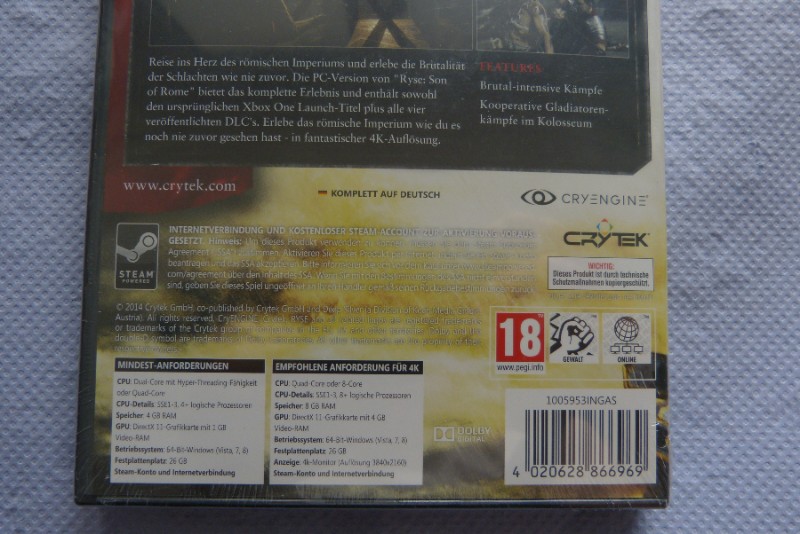 Dieses Produkt ist für Erwachsene (USK 18) gedacht und bietet eine unglaublich detaillierte und tiefgründige Erzählweise, die Sie durch emotionale Höhen und Tiefen führen wird. Die Kombination aus einer starken Handlung, atemberaubender Grafik und dynamischem Gameplay macht Ryse zu einem Muss für Liebhaber von historischen und actionreichen Spielen.