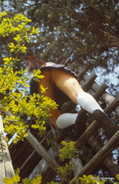 Das Kunstwerk zeigt eine junge Frau auf einer Holzleiter, die sorgfältig in einem grünen, blühenden Buschwerk positioniert ist. Ihre Pose ist sowohl provokant als auch kunstvoll, was typisch für die feinfühlige Handschrift von Dominik Alterio ist. Die Frau trägt klassische weiße Kniestrümpfe und ein schwarz-weißes Kleid, das einen spannenden Kontrast zum lebendigen Grün der Umgebung bildet. Ihre roten Haare sind passend zur natürlichen Umgebung und geben dem Bild eine zusätzliche farbliche Tiefe.