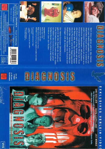 Das Artwork des Covers fängt sofort die Aufmerksamkeit und verspricht eine düstere und spannende Erfahrung. Der Titel "DIAGNOSIS" ist prominent platziert und unterstrichen durch das Bild eines verstörenden Monsters, was die dunkle und mysteriöse Atmosphäre des Films unterstreicht. Sichern Sie sich dieses seltene Stück Filmgeschichte, bevor es aus den Regalen verschwindet. Die VHS-Kassette ist perfekt für alle, die die Nostalgie des physischen Filmformats schätzen und gleichzeitig einen Thrill suchen, den nur ein echter Horrorfilm liefern kann.