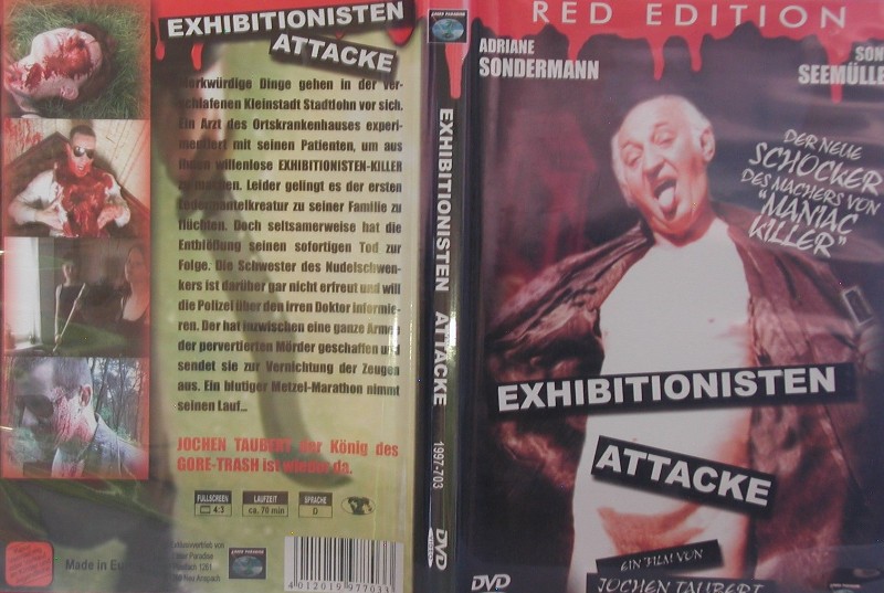 Exhibitionisten-Attacke ist der neueste Horrorstreifen, der aus den kreativen Köpfen hinter "Maniac Killer" entsprungen ist. Diese Red Edition garantiert Schrecken und Nervenkitzel vom Feinsten und ist definitiv nichts für schwache Nerven. Setze dich auf eine bedrohliche Reise in eine verschlafene Kleinstadt, die durch makabre Experimente eines Arztes in Angst und Schrecken versetzt wird. Der DVD-Horrorfilm überzeugt durch packende Spezialeffekte und eine atmosphärisch dichte Handlung, die dich von der ersten Minute an in ihren Bann zieht. Mit Spannungsgaranten Adriane Sondermann und Sönke Seemüller in Hauptrollen ist dieser Film ein absolutes Must-See für Fans des Genres. Dieser FULL UNCUT-Film liefert dir die volle Dröhnung und macht keine Kompromisse bei der Darstellung des Grauens. Greif jetzt zu und vervollständige deine Sammlung mit diesem Meisterwerk des Gore-Trashs.