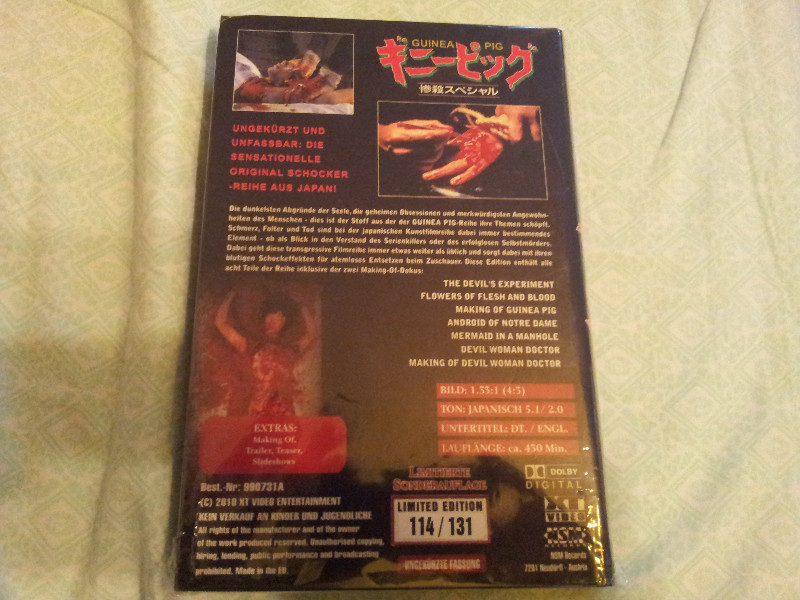 Jetzt ist der perfekte Zeitpunkt, Ihre Sammlung zu erweitern und sich dieses rare Sammlerstück zu sichern. Machen Sie sich bereit für Augenblicke, die den Atem stocken lassen und zum Nägelkauen führen. Holen Sie sich die Guinea Pig XT-Video 4DISK Edition 131 Gr. Hartbox und tauchen Sie ein in die unheimliche Welt des extremen Kinos. Seien Sie schnell – für echte Fans gibt es nichts Vergleichbares!