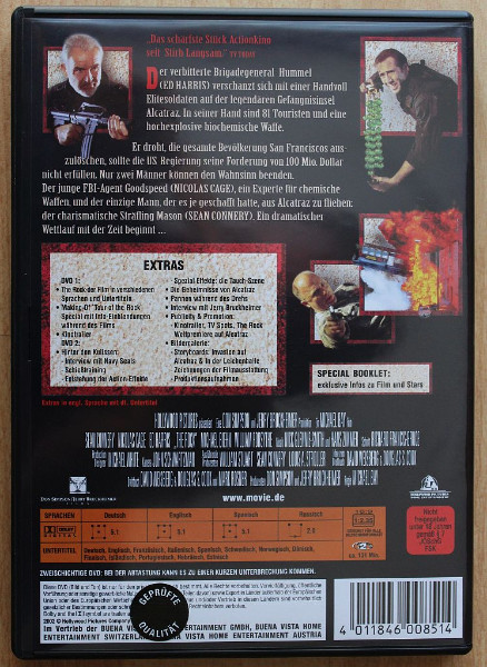 Erleben Sie die Starbesetzung mit Sean Connery, Nicolas Cage und Ed Harris in Höchstform. Der Film entfaltet sich vor der atemberaubenden Kulisse von Alcatraz und entführt den Zuschauer in eine packende Geschichte voller Dramatik und explosiver Action. Mit der Deluxe Edition erhalten Sie zudem eine zusätzliches Bonus-DVD mit vielen Extras, die die gesamte Thematik rund um Alcatraz und die Produktion des Films beleuchtet.