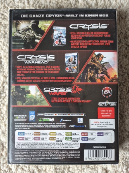 Die Spiele sind bekannt für ihre bahnbrechende Grafik, die selbst die leistungsstärksten PC-Systeme auf die Probe stellt. Die detailreiche Spielwelt, die komplexe Physik und die beeindruckende KI bieten ein immersives Spielerlebnis, das in Erinnerung bleibt. Crysis - Maximum Edition ist nur DVD-ROM-kompatibel und bringt die Intensität und den Umfang der Crysis-Welt auf Ihren PC.