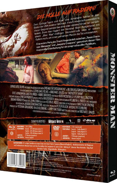 Das Mediabook präsentiert den Film "Monster Man" in einer hochwertigen Verpackung, die sofort ins Auge sticht. Das Cover zeichnet sich durch sein fesselndes Design aus, mit gruseligen und intensiven Bildern, die perfekt die spannungsgeladene Atmosphäre des Films einfangen. Es bietet die ideale Voraussetzung für einen schaurigen Filmabend. Die Sonderausgabe ist nicht nur eine visuelle Bereicherung, sondern überzeugt auch durch exklusive Extras und Bonusmaterial, die tiefere Einblicke in die Entstehung des Films gewähren.