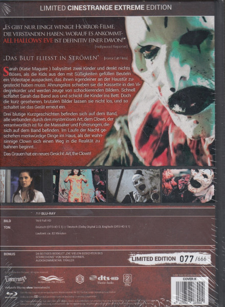 Das Mediabook enthält neben dem Hauptfilm zahlreiche Extras und Bonusmaterial, welches tiefe Einblicke in die Entstehung des Films bietet. Verpackt in einer aufwendig gestalteten Box, die sowohl ästhetisch ansprechend als auch thematisch passend zur düsteren Atmosphäre des Films ist, repräsentiert diese Edition wahre Sammlerqualität. Zögern Sie nicht und sichern Sie sich ein Exemplar von "Terrifier - The Beginning - Mediabook 77", bevor es ausverkauft ist. Perfekt für eine gruselige Filmnacht oder als Highlight jeder Horrorfilm-Sammlung.