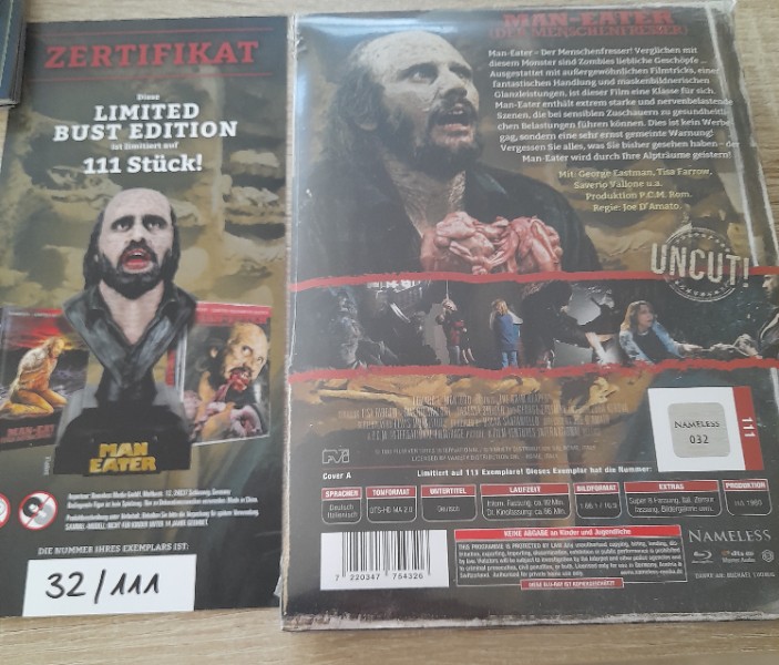 Ich biete hier die Büstenedition des Films Man-Eater von Nameless an. Die Edition ist lange Out Of Print und sehr gesucht. Es ist alles OVP, lediglich die Vepackung der Büste wurde kurz für das Foto geöffnet, jedoch sofort wieder verschlossen. Es handelt sich hier um die Nr. 32 von 111 Exemplaren weltweit.